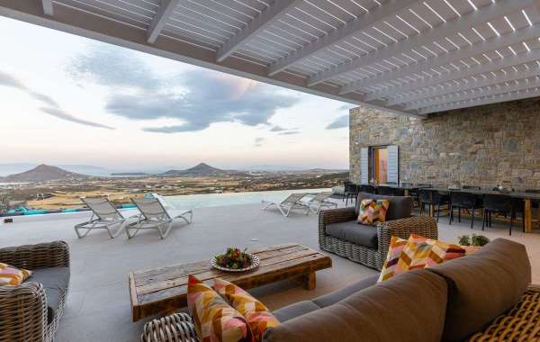 The pool area offers stunning views of the coast of Paros and Naxos and has sun loungers available for sunbathing or relaxing in the shade. A sitting area is located next to the pool, with seating for 10 people, perfect for enjoying the golden hour light and a drink at night.