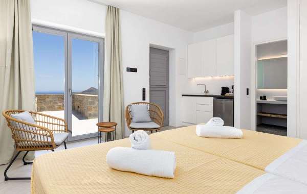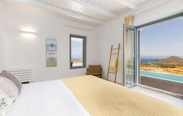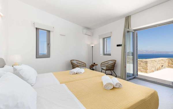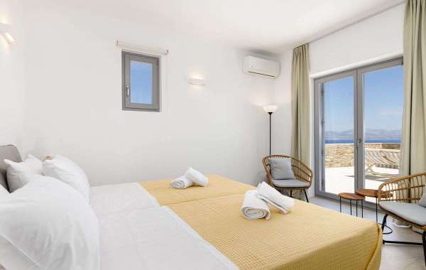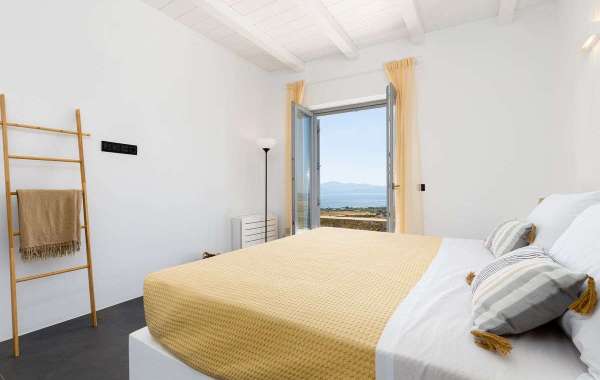 The kitchen, dining and living area are separate from the bedrooms and offer a view of the pool, sea and the island of Naxos. Large sliding glass doors allow for plenty of natural light and can be opened to let in a refreshing breeze. The dining table comfortably seats 12 guests and the fully-equipped kitchen has everything you need to prepare meals and drinks. The living area features a large and comfortable couch as well as two stylish sofas, all facing a beautiful view of the sea and consists of a large and comfy couch as well as two stylish sofas. And if you wish, you can jump straight from here into the refreshing pool!