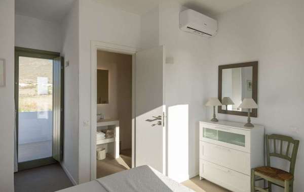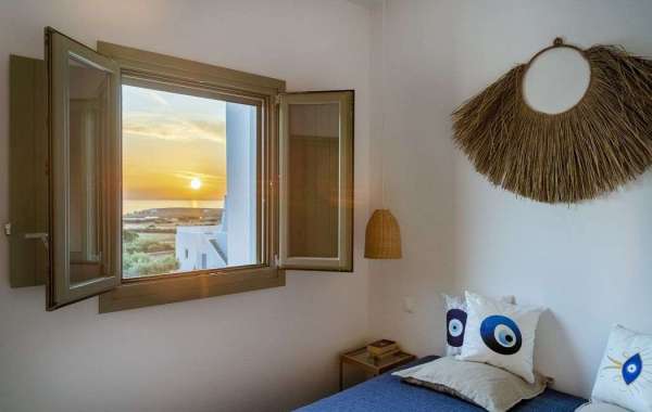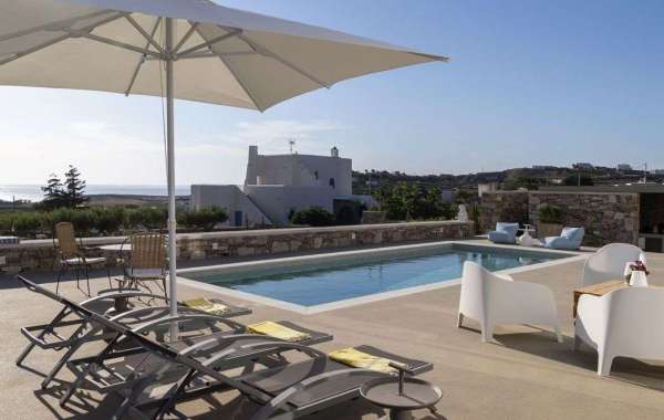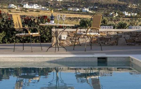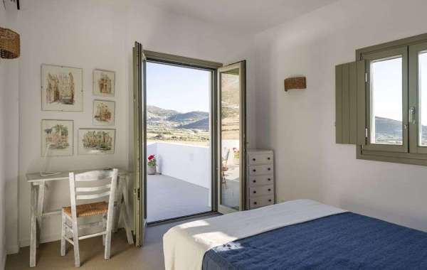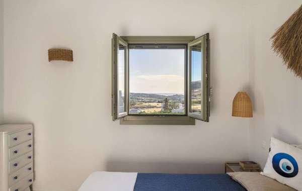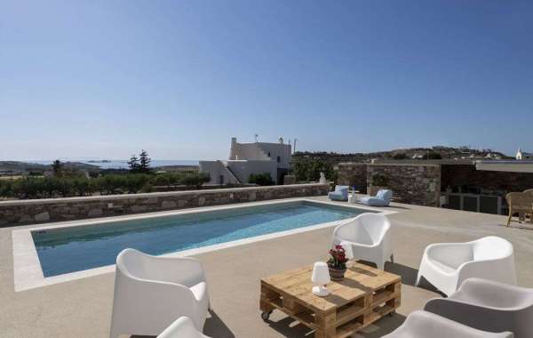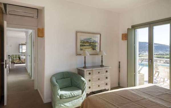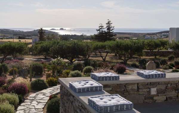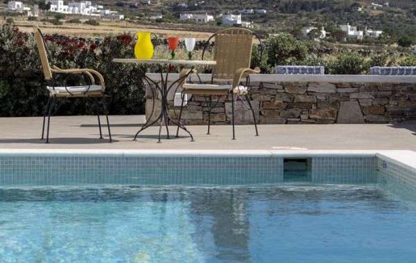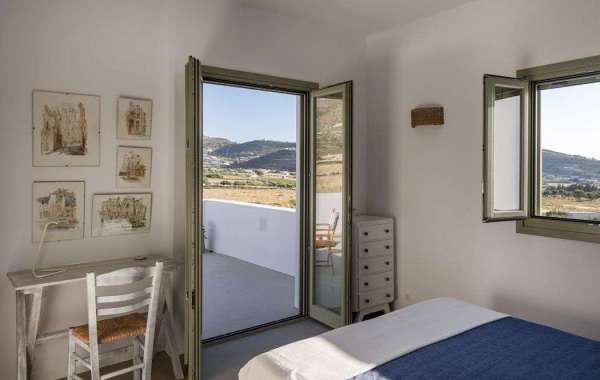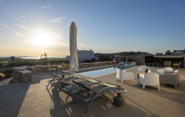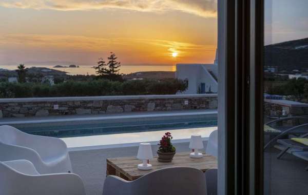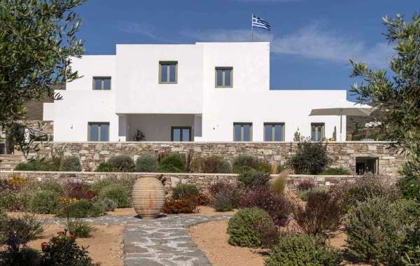 Villa Eloise is a beautiful contemporary house designed by a local well-known architect and situated between the sea and the mountains, located near Paroikia and 15 minutes of a nice walk to the beautiful beach of Parasporos. The property is surrounded by a Mediterranean garden and faces a field of olive trees. The terrace with the swimming pool is the perfect setting for a mind-blowing sunset over the sea and the sailing boats in the beautiful Aegean Sea.